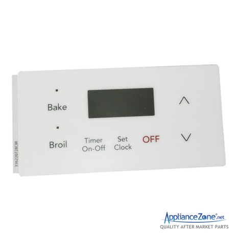 Replacement control overlay used on some Crosley, Frigidaire, Gibson, Ikea, Kenmore, Tappan, Universal / Multiflex, and White-Westinghouse range models.