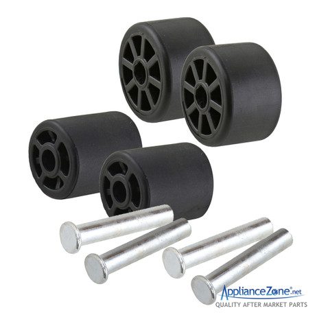 Replacement front and rear caster wheels with axles used for some Kenmore and Samsung refrigerator models.