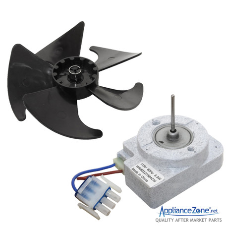Replacement evaporator fan motor and blade used for some Americana, GE, Hotpoint, and RCA refrigerator models.
